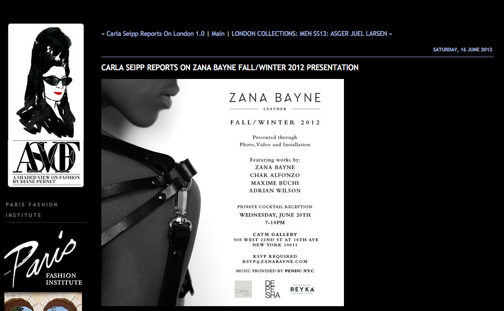 This Wednesday, leather accessories designer Zana Bayne will be presenting her Fall/Winter 2012 collection, inspired by skeletal forms, Prague’s Kutna Hora bone church and Dia De Los Muertos decorations at the CATM Gallery in New York.