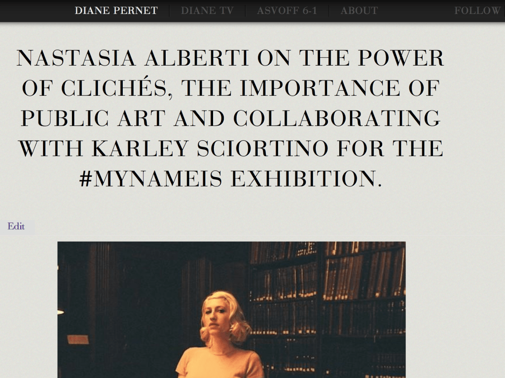 Annin Arts is bringing art to the masses, literally, with their latest exhibition #MYNAMEIS. The show sees five artworks by Nastasia Alberti, Duval Timothy, Kevin Morosky, Annie Mackin and Gillian Wearing displayed on single billboards throughout London. While #MYNAMEIS brings up intriguing questions surrounding a different kind of interaction with art outside of exclusive gallery walls, its main focus lies in the importance, perception and burdens of names.London-based artist Nastasia Alberti chose Slutever blogger and Vogue columnist Karley Sciortino as her subject, depicting the writer in a sepia-toned portrait. In the following interview, Alberti discusses hours of location scouting in public libraries, the single image that inspired her to take up photography and why art consumption needs to catch up with our busy schedules.